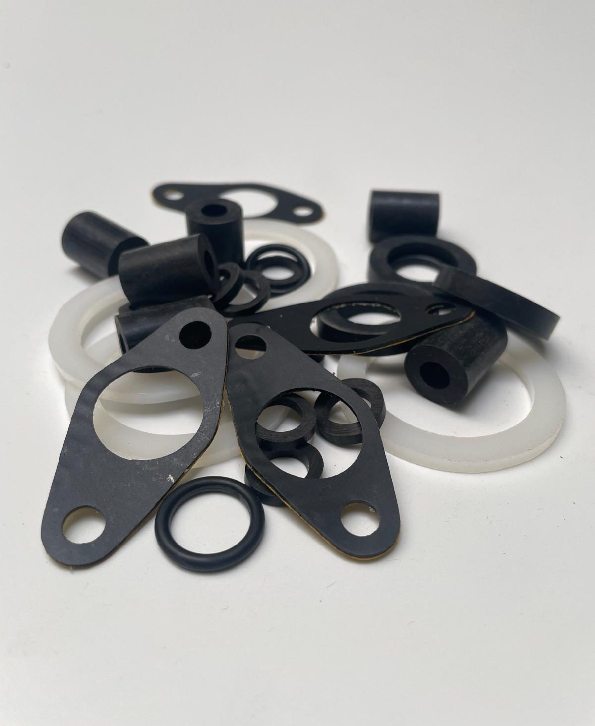 Treballem amb una gran varietat de materials, com cautxús (goma verge [NR], SBR, EPDM, nitril [NBR], neopré [CR], silicona [VMQ], Vitó [FKM], butil, Hypalon), espumes tècniques, cartrons comprimits, plàstics tècnics (polietilè [PE], poliamida [PA], polipropilè [PP], PVC, PTFE), paper engreixat, suro i feltres. Ens assegurem que cada peça compleixi els requisits tècnics i s’ajusti a les especificacions del client.